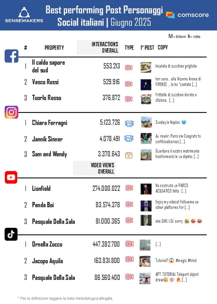 Ora disponibile la classifica dei Top 15 Personaggi social italiani di giugno, elaborata da Sensemakers in collaborazione con Prima Online, sulla base dei dati Comscore Socialrilevati monitorando interazioni e video views sulle principali piattaforme social.