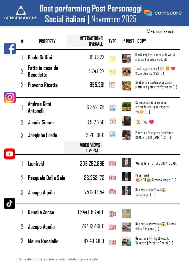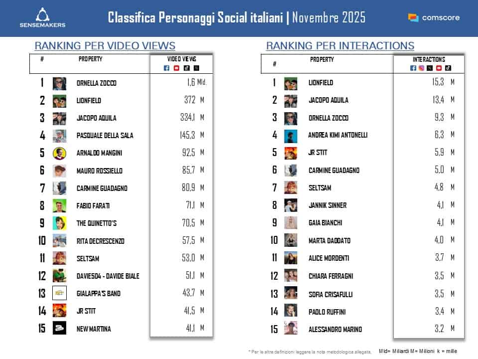 Ora disponibile la classifica dei Top 15 Personaggi social italiani di novembre, elaborata da Sensemakers in collaborazione con Prima Online, sulla base dei dati Comscore Social rilevati monitorando interazioni e video views sulle principali piattaforme social.