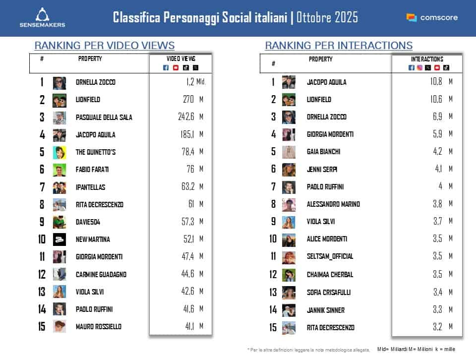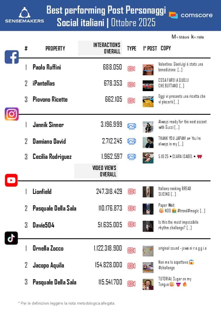Ora disponibile la classifica dei Top 15 Personaggi social italiani di ottobre, elaborata da Sensemakers in collaborazione con Prima Online, sulla base dei dati Comscore Social rilevati monitorando interazioni e video views sulle principali piattaforme social.