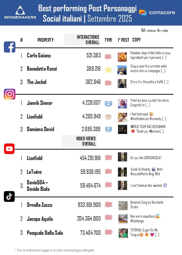 Jannik Sinner, Damiano David e Olly si distinguono in classifica non tanto per la creatività dei loro contenuti, quanto per la visibilità offerta dalla loro professione, che li rende figure social capaci di influenzare e generare engagement.