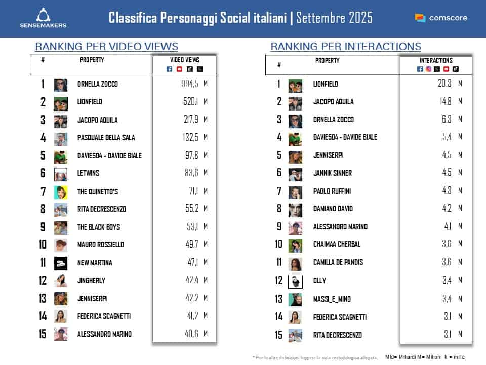 Ora disponibile la classifica dei Top 15 Personaggi social italiani di settembre, elaborata da Sensemakers in collaborazione con Prima Online, sulla base dei dati Comscore Shareablee rilevati monitorando interazioni e video views sulle principali piattaforme social.