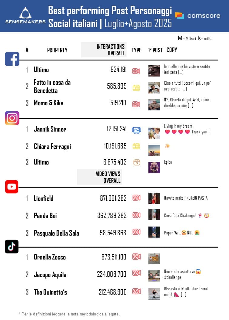 Nel ranking per interazioni spicca la presenza di Jannik Sinner. Il tennista ha registrato alti volumi di engagement raccontando sui propri canali social la sua estate sportiva, coronata dalla vittoria a Wimbledon. Il post dedicato al trionfo ha sfiorato i 2 milioni di interazioni.