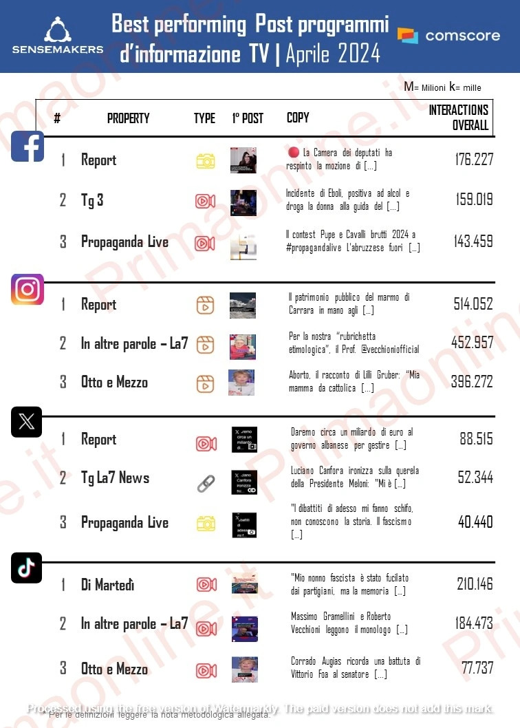 Pubblicata la classifica dei Top Programmi TV d’Informazione più attivi sui social a aprile, elaborata da Sensemakers in collaborazione con Prima Comunicazione, sulla base dei dati Comscore Social  rilevati monitorando interazioni video views sulle principali piattaforme social.