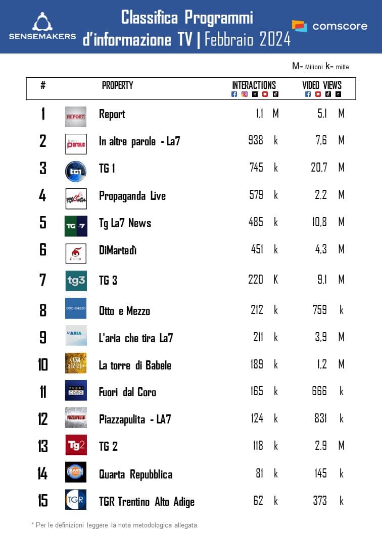 Pubblicata la classifica dei Top Programmi TV d’Informazione più attivi sui social a febbraio, elaborata da Sensemakers in collaborazione con Prima Comunicazione, sulla base dei dati Comscore Social rilevati monitorando interazioni e video views sulle principali piattaforme social.