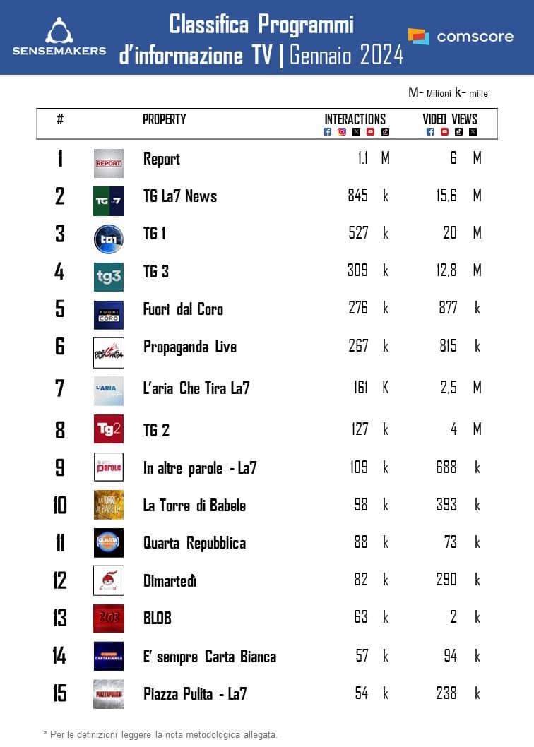 Classifica dei Top Programmi TV d’Informazione Italiani per interazioni e video views sui contenuti pubblicati nel mese di riferimento.