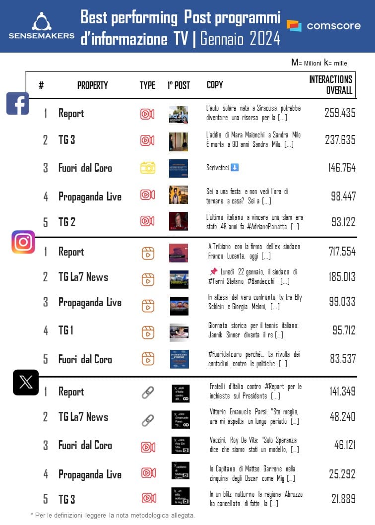 Pubblicata la classifica dei Top Programmi TV d’Informazione più attivi sui social a gennaio, elaborata da Sensemakers in collaborazione con Prima Comunicazione, sulla base dei dati Comscore Social rilevati monitorando interazioni e video views sulle principali piattaforme social.