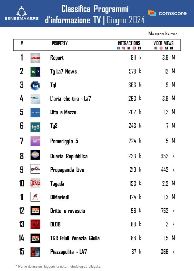 Classifica dei Top Programmi TV d’Informazione Italiani per interazioni e video views sui contenuti pubblicati nel mese di riferimento.
