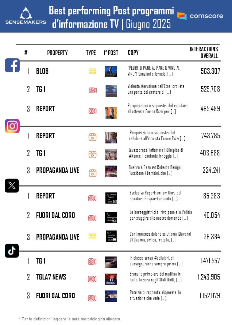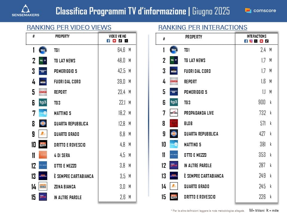 Pubblicata la classifica dei Top Programmi TV d’Informazione più attivi sui social a giugno, elaborata da Sensemakers in collaborazione con Prima Comunicazione, sulla base dei dati Comscore Social rilevati monitorando interazioni e video views sulle principali piattaforme social.