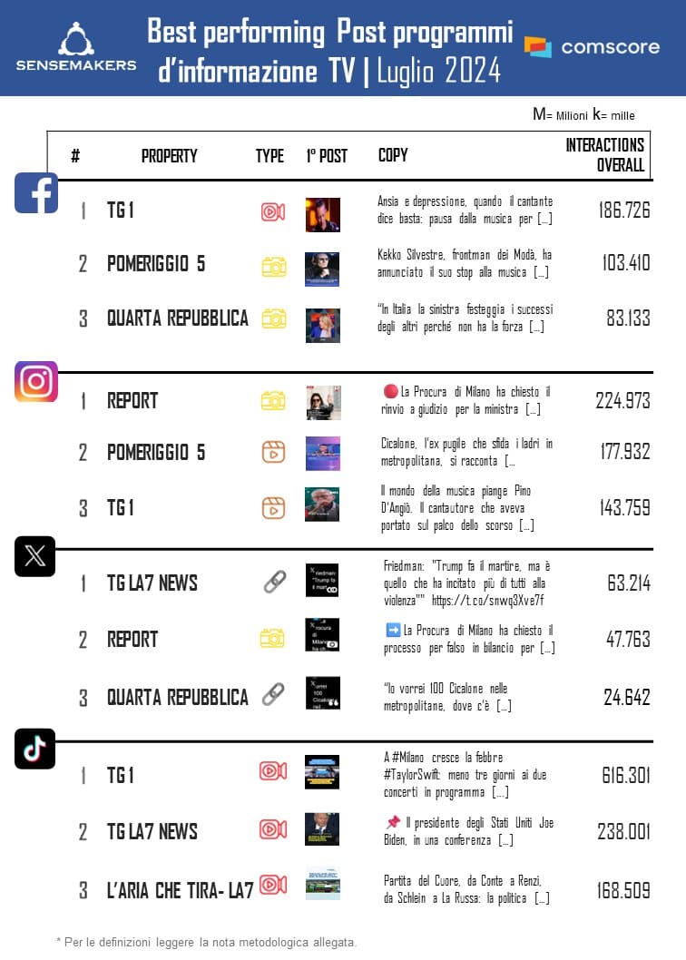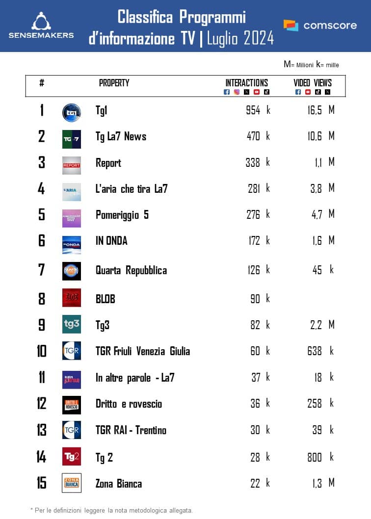Pubblicata la classifica dei Top Programmi TV d’Informazione più attivi sui social a luglio, elaborata da Sensemakers in collaborazione con Prima Comunicazione, sulla base dei dati Comscore Social rilevati monitorando interazioni e video views sulle principali piattaforme social.