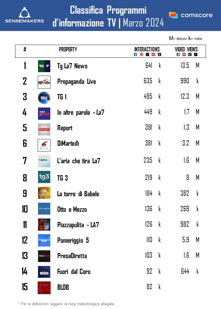 Pubblicata la classifica dei Top Programmi TV d’Informazione più attivi sui social a marzo, elaborata da Sensemakers in collaborazione con Prima Comunicazione, sulla base dei dati Comscore Social rilevati monitorando interazioni e video views sulle principali piattaforme social.