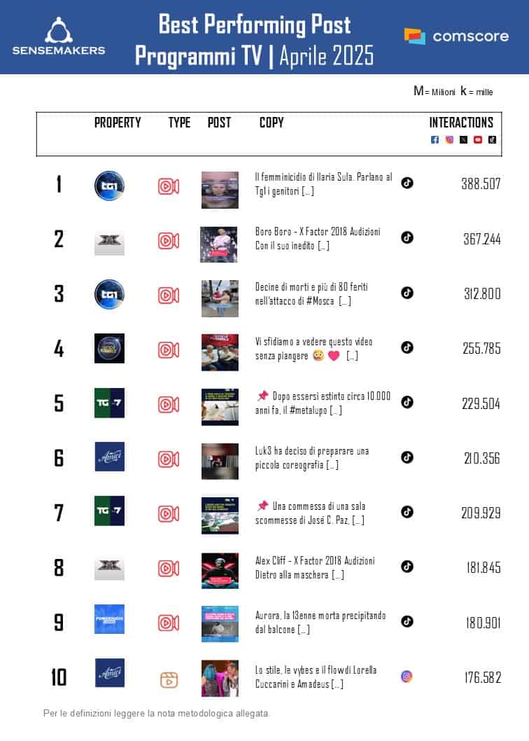 Il ranking dei Best Performing Post risulta più eterogeneo rispetto al mese scorso, grazie all’ingresso di una pluralità di attori provenienti da generi televisivi differenti. A fare da filo conduttore tra i contenuti di maggior successo è l’ottima performance della piattaforma TikTok.