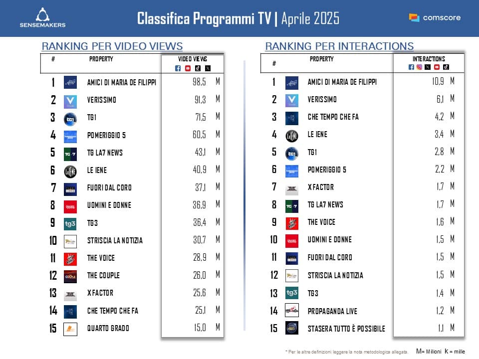 Nonostante mantengano la vetta in entrambe le classifiche, Amici e Verissimo registrano un calo significativo: Amici accusa maggiormente la flessione delle video views (-24%), mentre Verissimo è penalizzato soprattutto sul fronte dell’engagement (-34%).