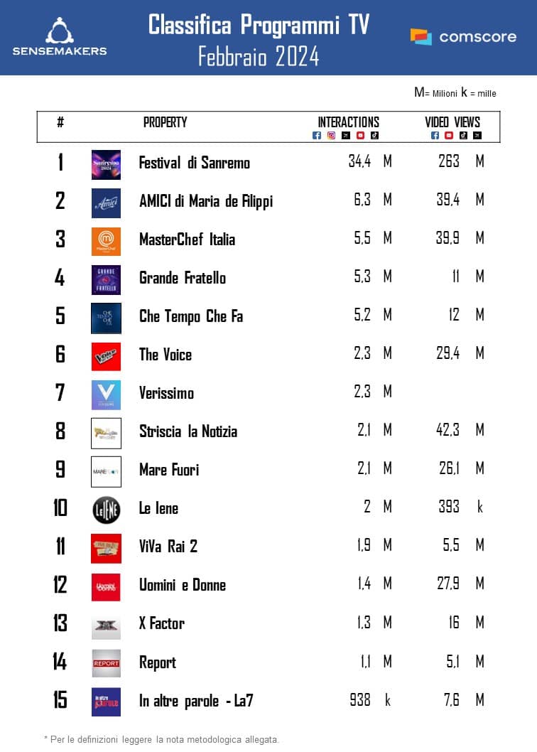 TOP 15 Programmi TV più attivi sui social, Febbraio 2024