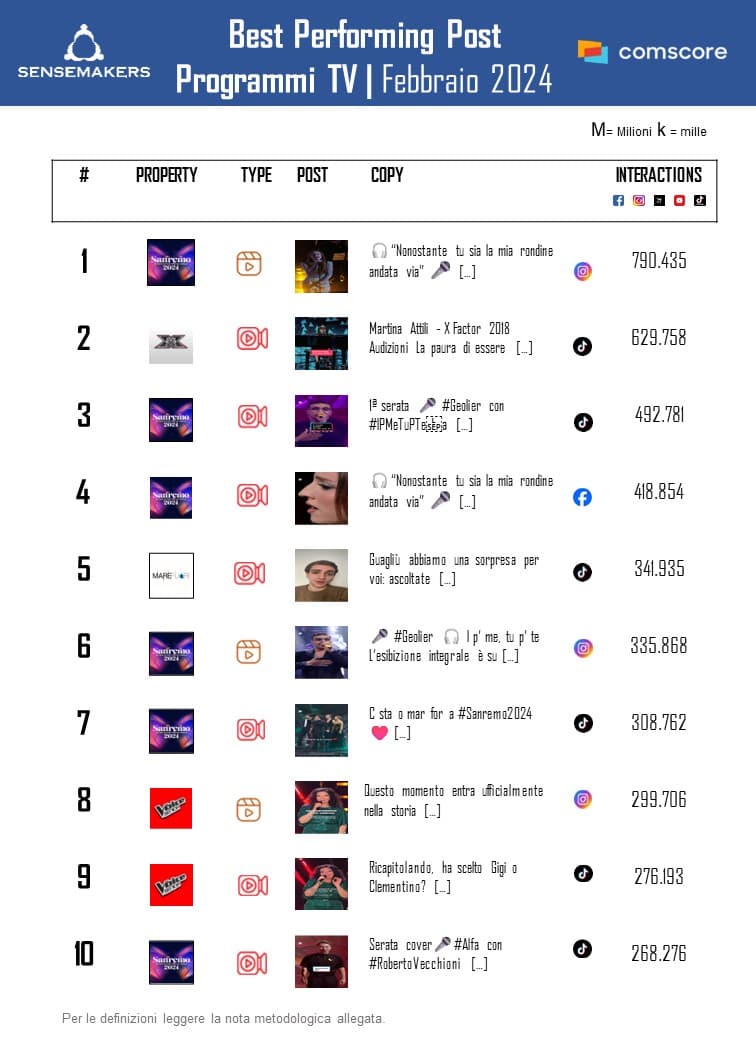 Rientra nel ranking anche “The Voice”, ripartito il 16 febbraio con l’edizione Senior. L’engagement è prevalentemente trainato da Instagram in termini di interazioni (50% del volume complessivo) e da TikTok per quanto riguarda le video views (61% del volume complessivo).