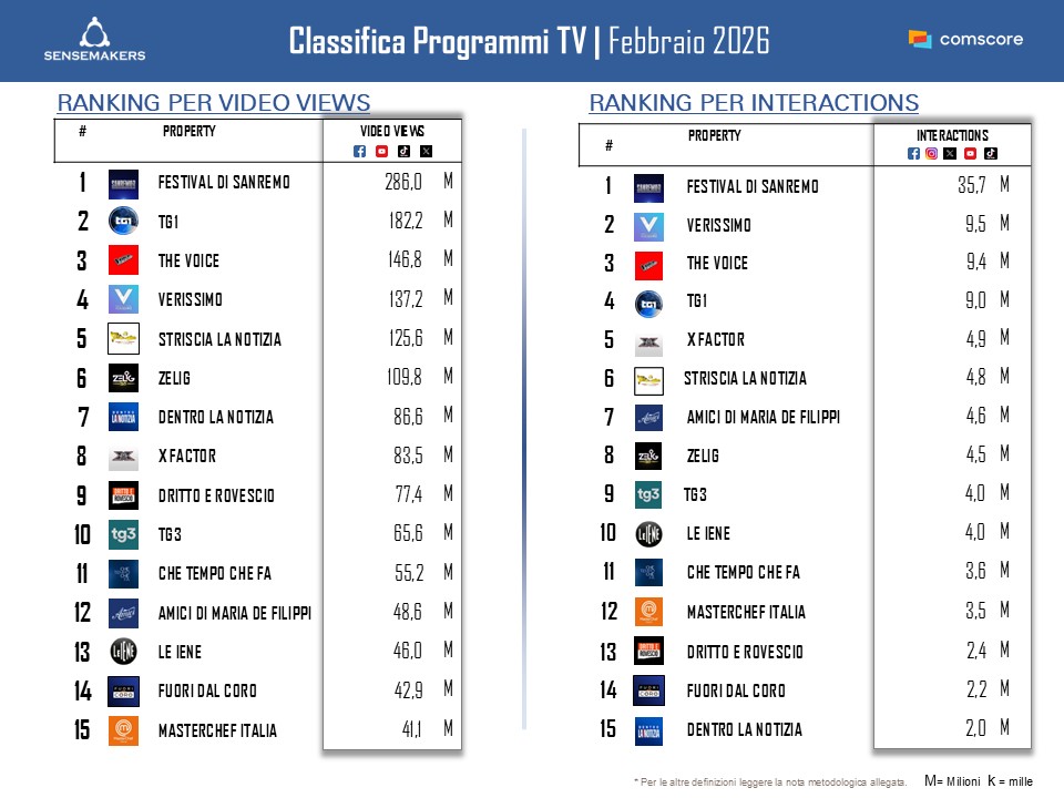 La classifica dei Top 15 Programmi TV di febbraio vede Sanremo al primo posto sia nel ranking delle interazioni sia in quello delle video views, con volumi che staccano nettamente rispetto agli altri attori presenti.