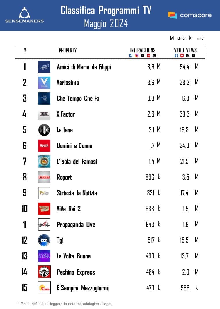 Pubblicata la classifica dei Top 15 programmi TV italiani più attivi sui social a maggio, elaborata da Sensemakers in collaborazione con Prima Online, sulla base dei dati Comscore Social rilevati monitorando interazioni e video views sulle principali piattaforme social (Facebook, Instagram, TikTok, Twitter, YouTube).