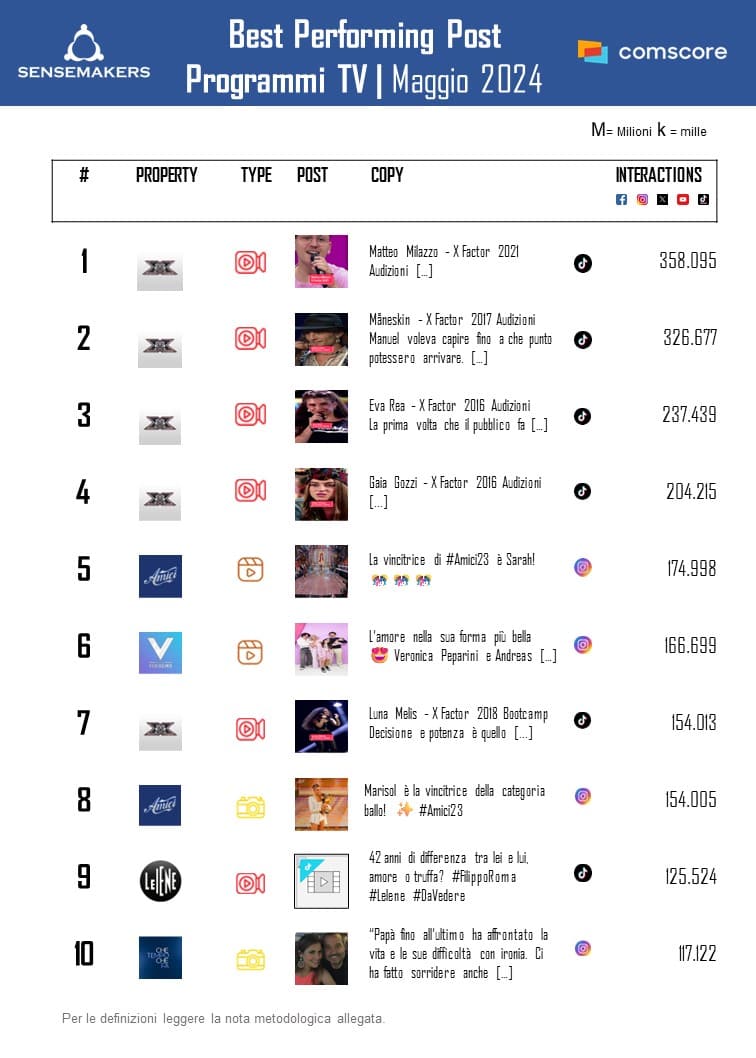 La classifica dei Best Performing Post si dimostra piuttosto omogenea sia in termini di tipologie di contenuti sia in quanto ad attori. Tuttavia, è “X Factor” il programma chiave che figura, infatti, con 5 contenuti su 10, monopolizzando le prime posizioni della classifica.