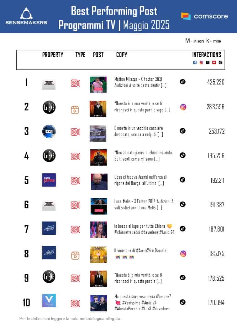 Nonostante il primo contenuto sia di X Factor, sono “Le Iene” a raccogliere il maggior numero di interazioni in questo ranking, grazie alla presenza di tre contenuti.