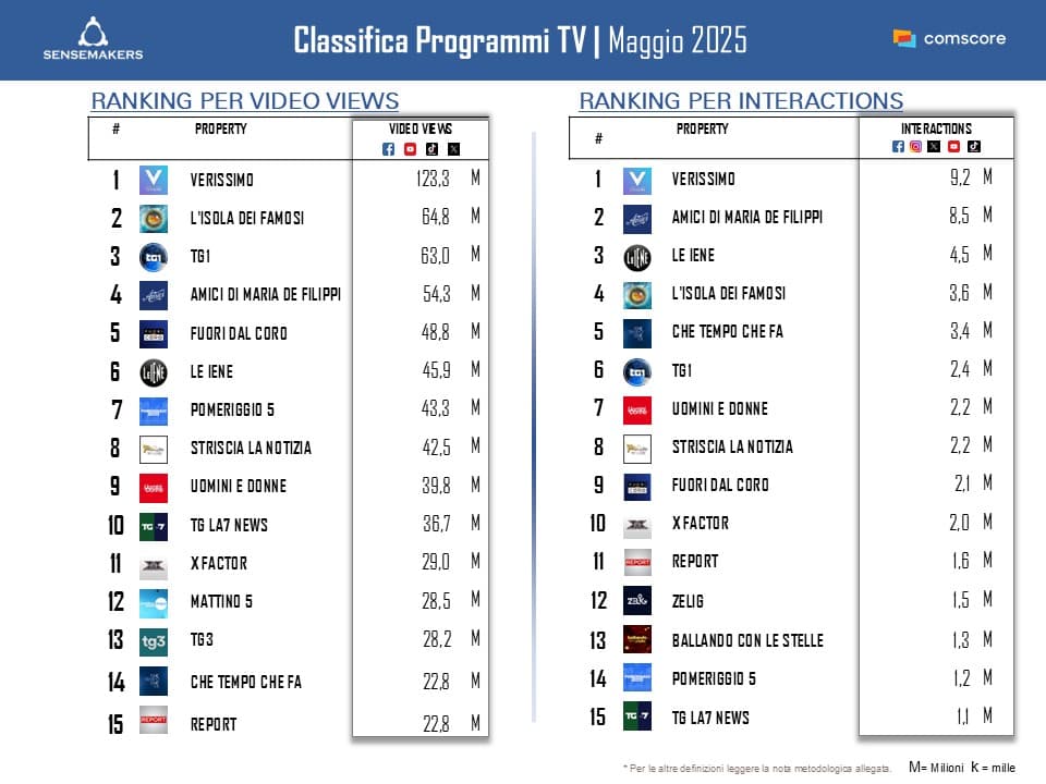 Pubblicata la classifica dei Top 15 programmi TV italiani più attivi sui social a Maggio, elaborata da Sensemakers in collaborazione con Prima Online, sulla base dei dati Comscore Social rilevati monitorando interazioni e video views sulle principali piattaforme social (Facebook, Instagram, TikTok, Twitter, YouTube).