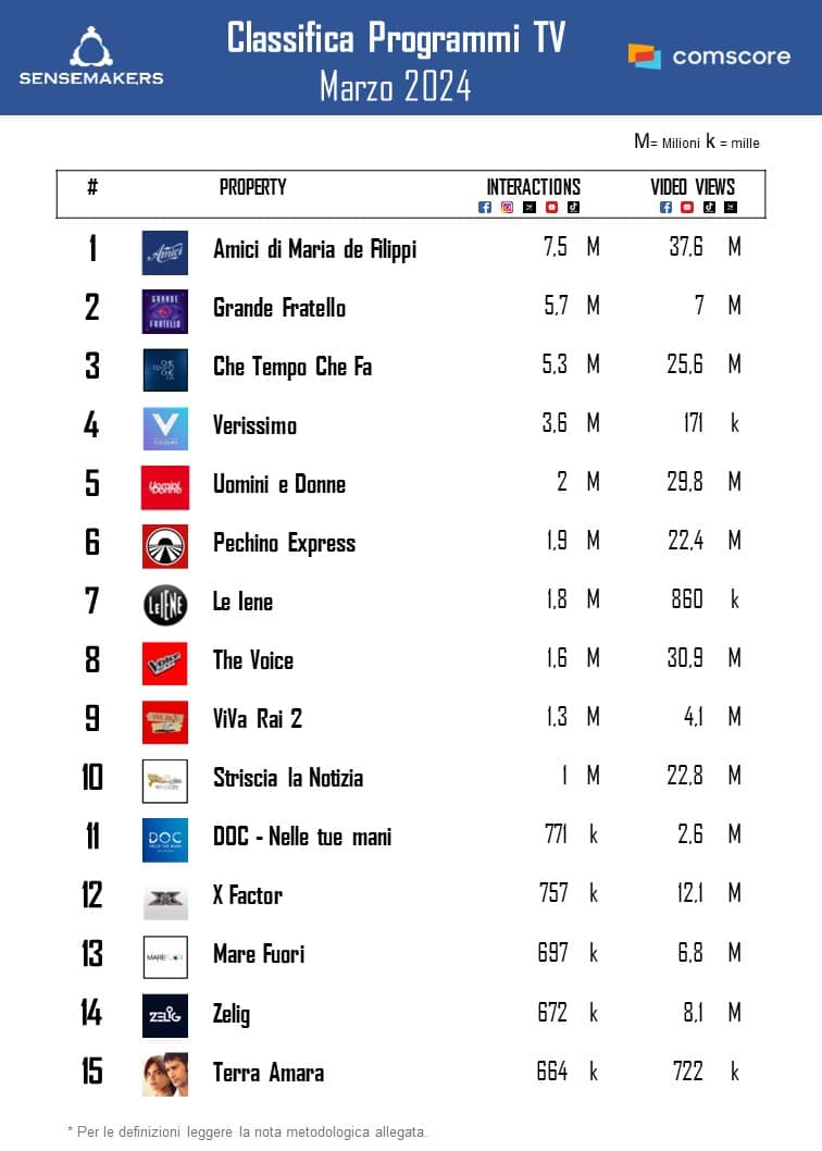 Pubblicata la classifica dei Top 15 programmi TV italiani più attivi sui social a marzo, elaborata da Sensemakers in collaborazione con Prima Online, sulla base dei dati Comscore Social rilevati monitorando interazioni video views sulle principali piattaforme social (FacebookInstagramTikTok, TwitterYouTube).