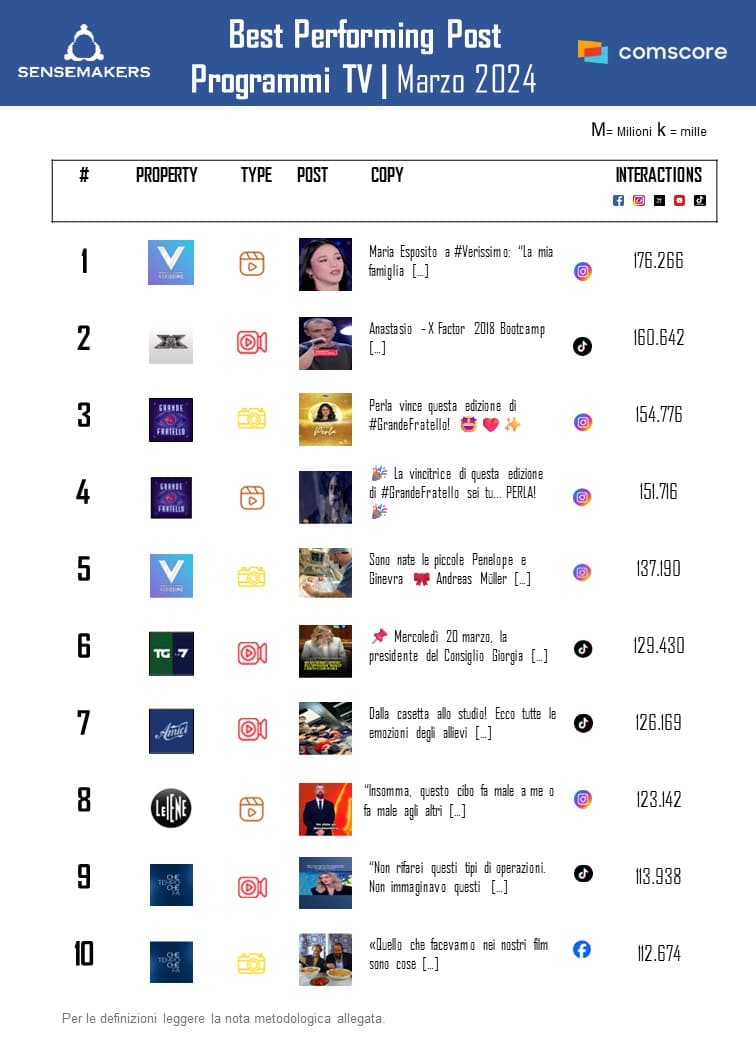 TOP 15 Programmi TV più attivi sui social, Marzo 2024