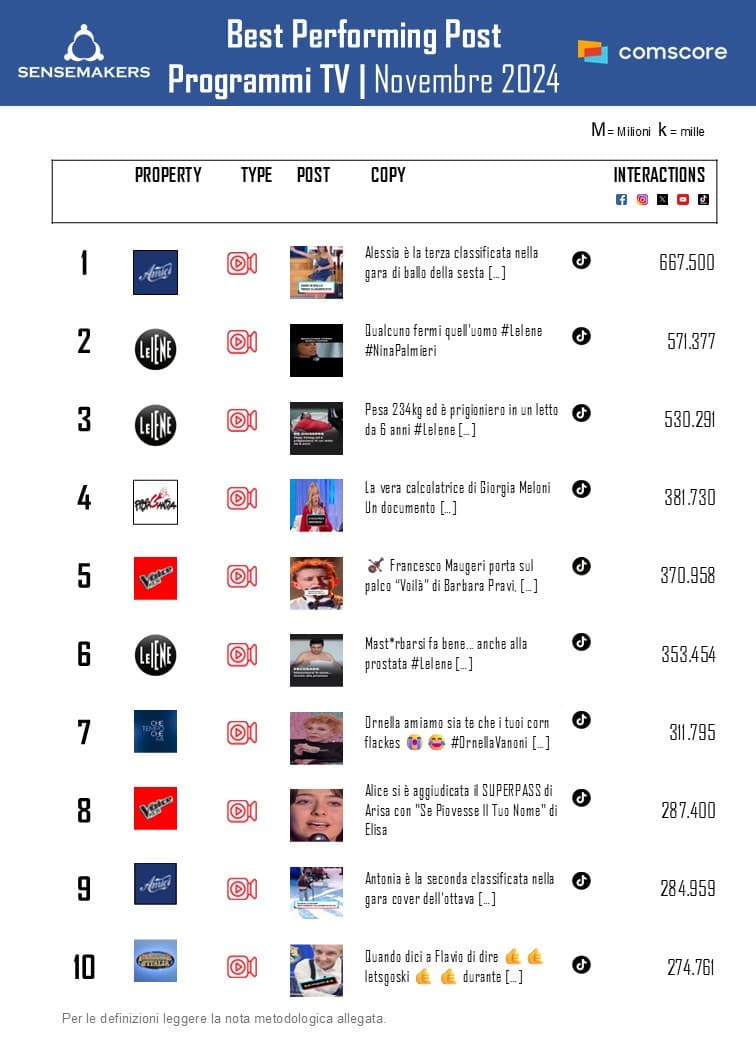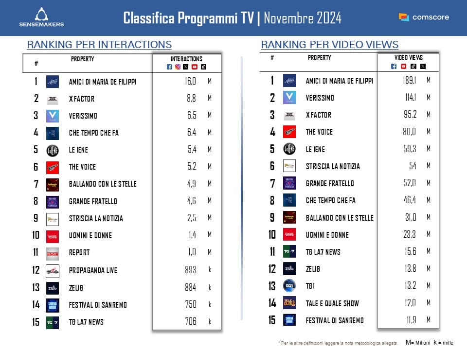 Pubblicata la classifica dei Top 15 programmi TV italiani più attivi sui social a novembre, elaborata da Sensemakers in collaborazione con Prima Online, sulla base dei dati Comscore Social rilevati monitorando interazioni e video views sulle principali piattaforme social (Facebook, Instagram, TikTok, Twitter, YouTube).