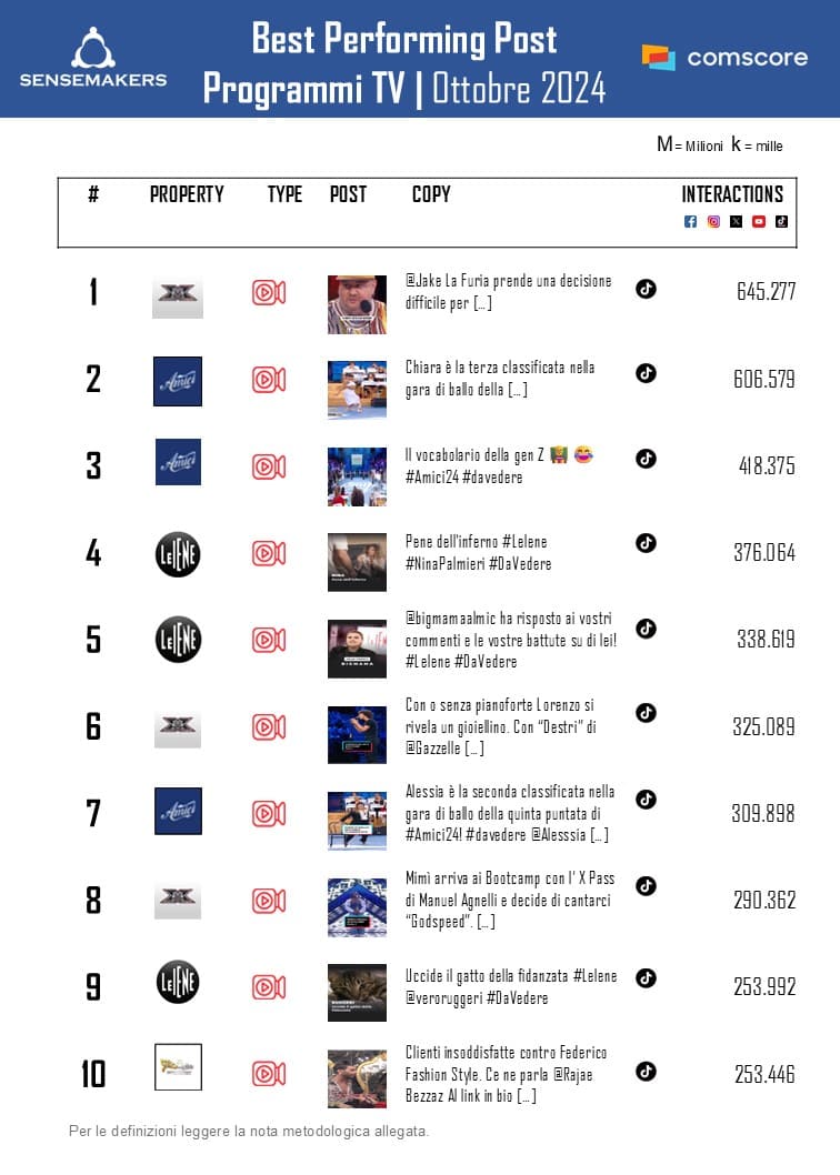 Il programma di Maria De Filippi, da quando è iniziato il pomeridiano il 29 settembre, ha registrato una crescita dei volumi. Le interazioni sono aumentate di 12 volte, seguite a ruota dalle video views.  “Amici” ottiene le migliori performance su TikTok, una piattaforma con cui il talent sembra avere un forte legame, visto che almeno due dei concorrenti di questa edizione, Diego Lazzari e Luk3, provengono dal mondo dei tiktoker. È interessante notare come nello stesso mese dell’anno precedente, le interazioni raccolte dal programma fossero meno della metà rispetto a quelle dell’ottobre di quest’anno.