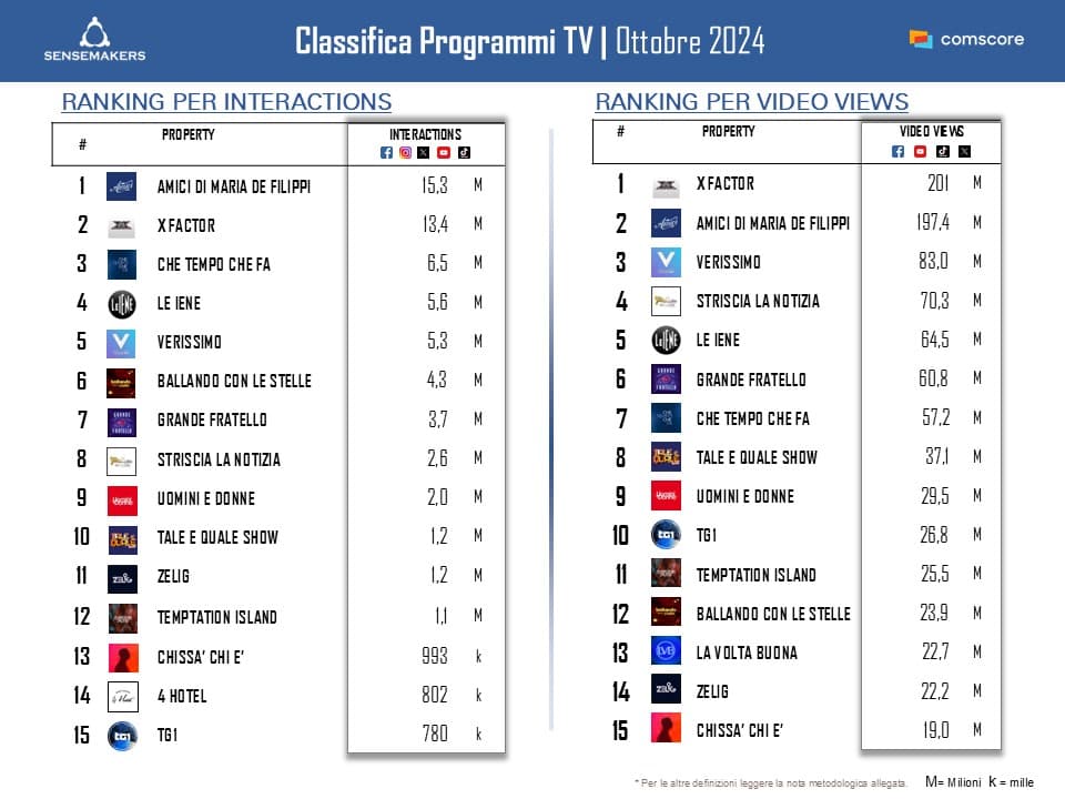 TOP 15 Programmi TV più attivi sui social, Ottobre 2024