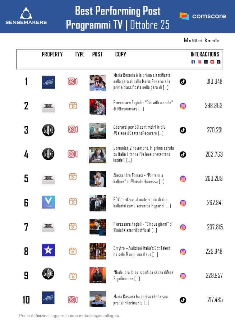 La classifica dei Top 15 Programmi TV di ottobre presenta un incremento significativo e generalizzato nei volumi di video views (+85%) e interazioni (+77%) raccolte.