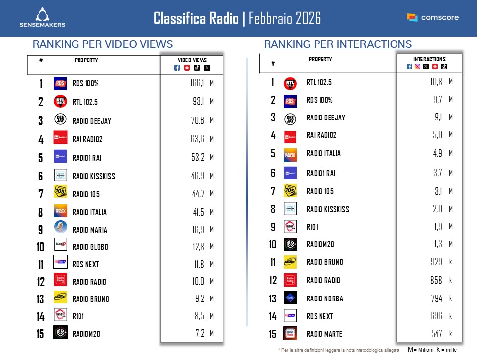 La classifica delle Top 15 Radio di febbraio, presenta volumi in netta crescita sia sul lato delle video views che su quello delle interazioni con numeri più che raddoppiati rispetto al mese precedente.