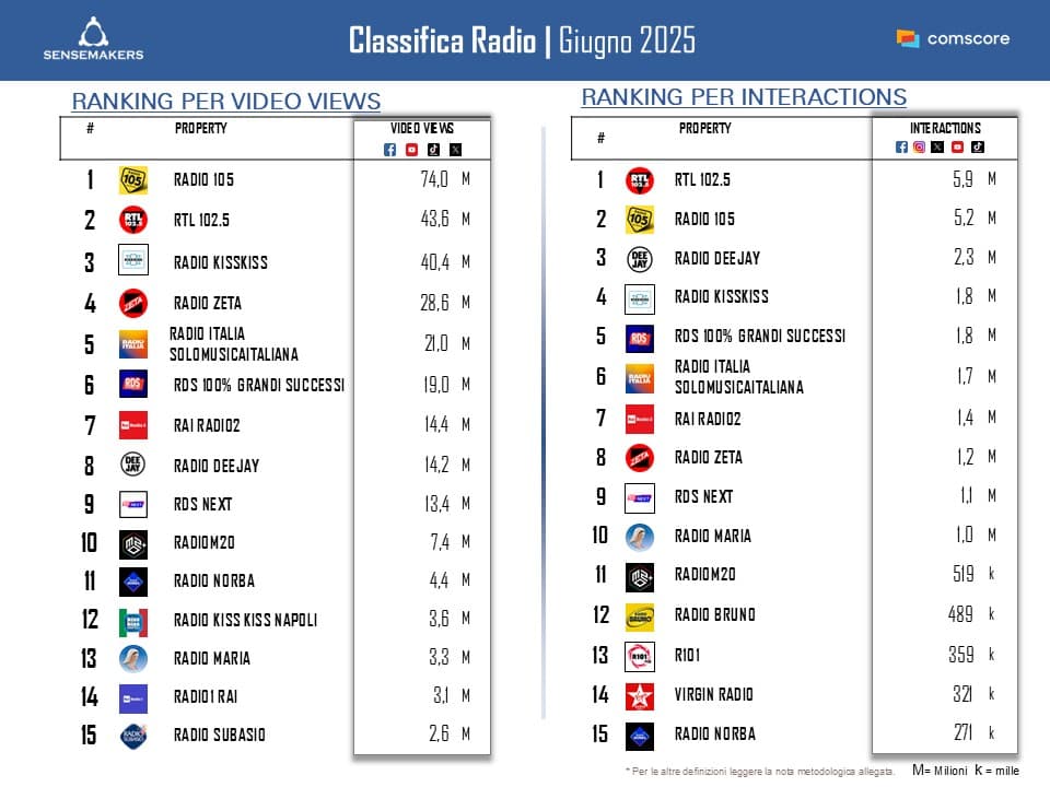 Da segnalare nel mese anche la “rimonta” di Radio Zeta, grazie ai “Radio Zeta Future Hits Live 2025” tenutesi il 1° giugno. Oltre il 40% dei contenuti pubblicati nel mese dalla radio include l’hashtag ufficiale dell’evento, che ha generato più del 50% delle visualizzazioni video complessive e oltre l’80% dell’engagement totale registrato.