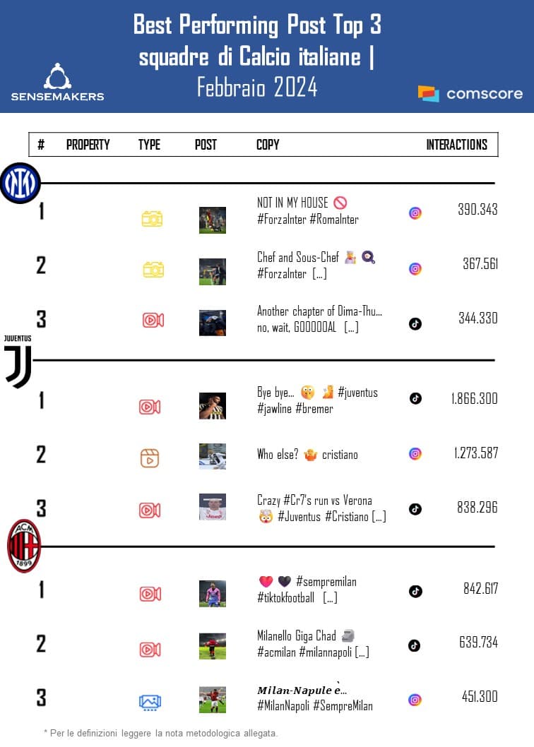 La Juve cede il passo e scivola in seconda posizione. Il club bianconero mostra un calo nelle performance sia social che sportive. Un minor numero di contenuti pubblicati che però, come si vede nella classifica dei Best Performing Post, ottengono sempre particolare seguito dall’audience social (media di 17.000 interazioni a post a fronte dei circa 11.000 totalizzati dall’Inter).