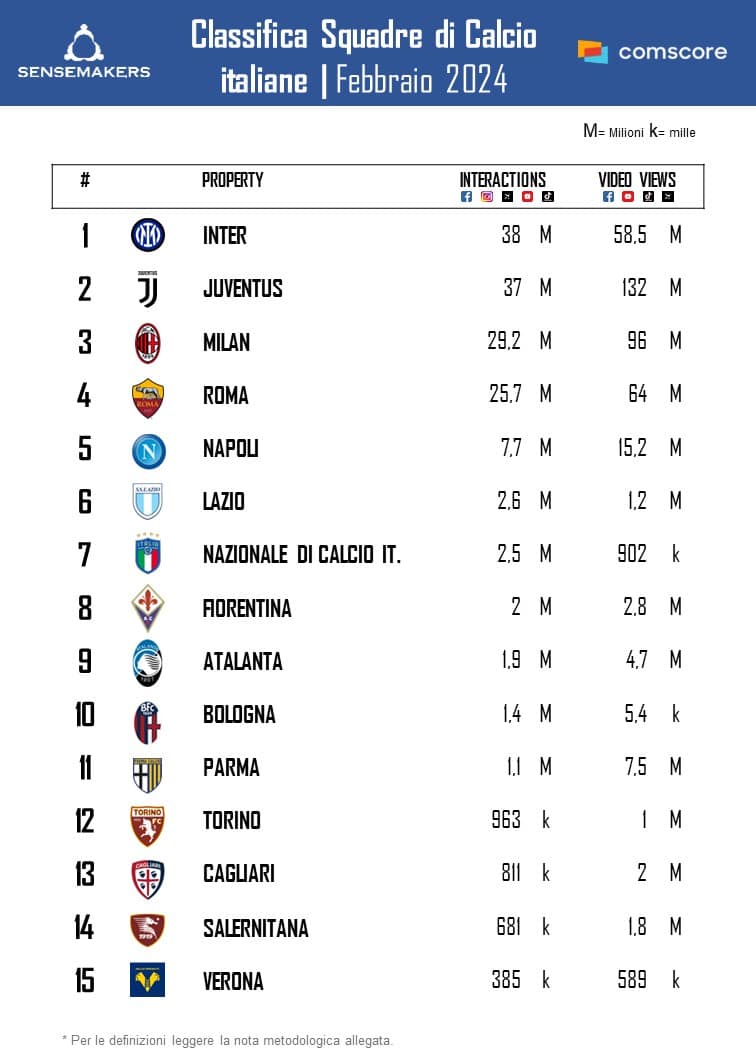 Il ranking riporta il dato di tutti gli account ufficiali delle squadre italiane. In caso di squadre con più account ufficiali il dato riporta l’aggregato dei diversi account. In particolare: