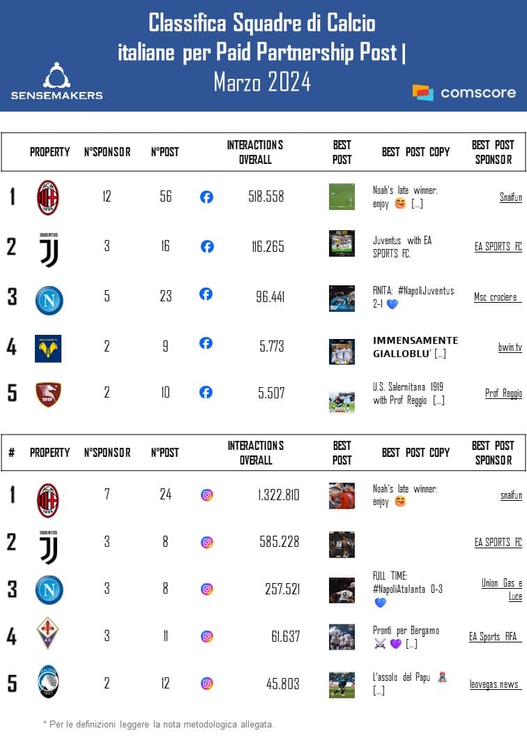 Nel Ranking delle Paid Partnership, il Milan si riconferma la squadra più attiva sul fronte collaborazioni.