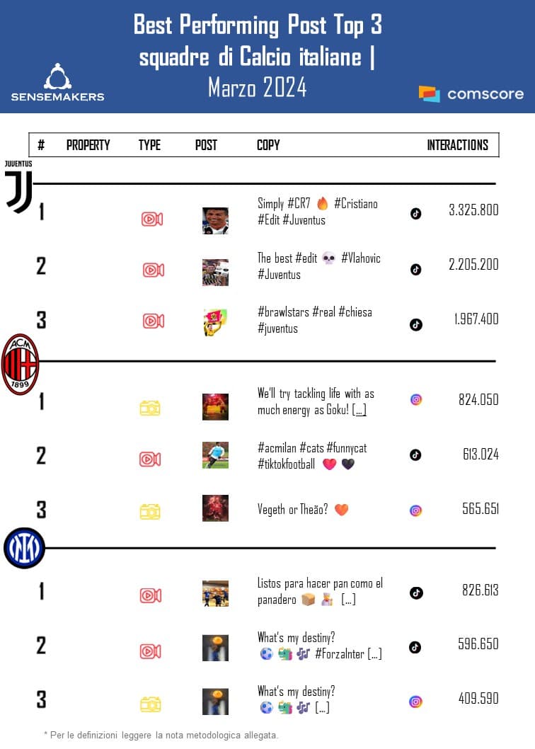 Il contenuto maggiormente performante è nuovamente “a tema” Ronaldo, che continua a garantire più di 3 milioni di interazioni e quasi 30 milioni di video views. Il club bianconero raggiunge i risultati migliori su TikTok, piattaforma che garantisce al team di totalizzare numeri sbalorditivi non solo in termini di interazioni ma anche di visualizzazioni video.