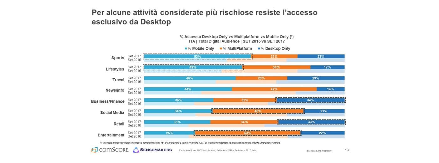 Dall’altro lato, nelle categorie come Retail e Business, in cui è forte l’elemento transattivo, la componente Desktop-Only ricopre ancora un ruolo importante (oltre il 30% per entrambe).