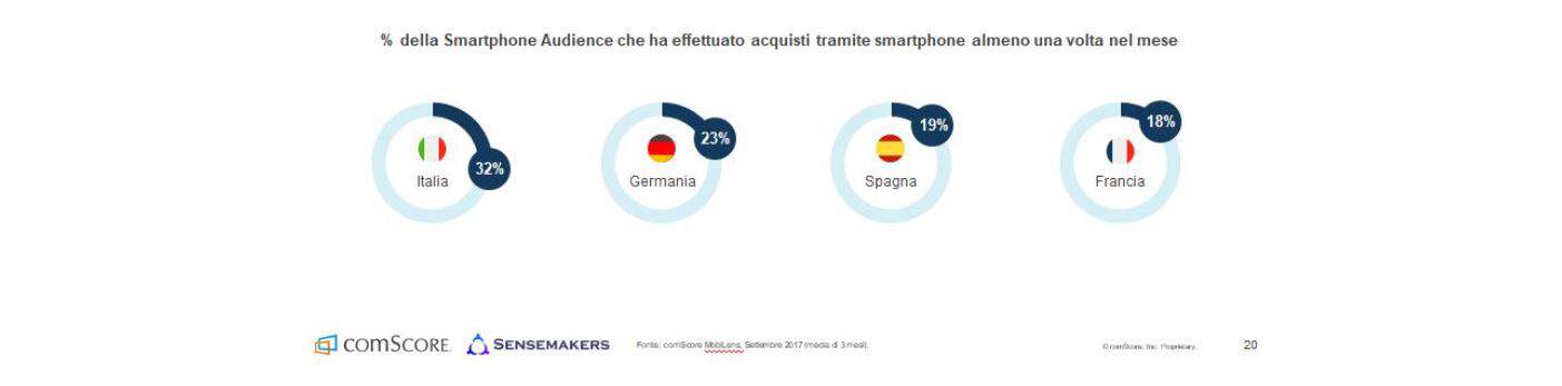 Gli italiani si mostrano inclini al mobile shopping, anche rispetto ad altri Paesi europei, la cui penetrazione sulla smartphone audience si aggira intorno al 20% (Germania al 23%, Spagna al 19%, Francia al 18%).