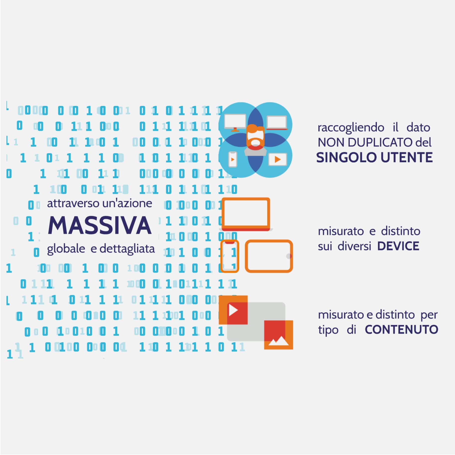 Conoscere il numero di utenti del proprio sito e su una sola piattaforma non è più sufficiente. Media Metrix Multi-Platform (MMX MP) fornisce il dato deduplicato degli utenti complessivi del tuo pubblico e di quello dei competitor, oltre a una panoramica completa sulle loro abitudini di consumo su ciascun device, insieme ad informazioni demografiche e di overlap.