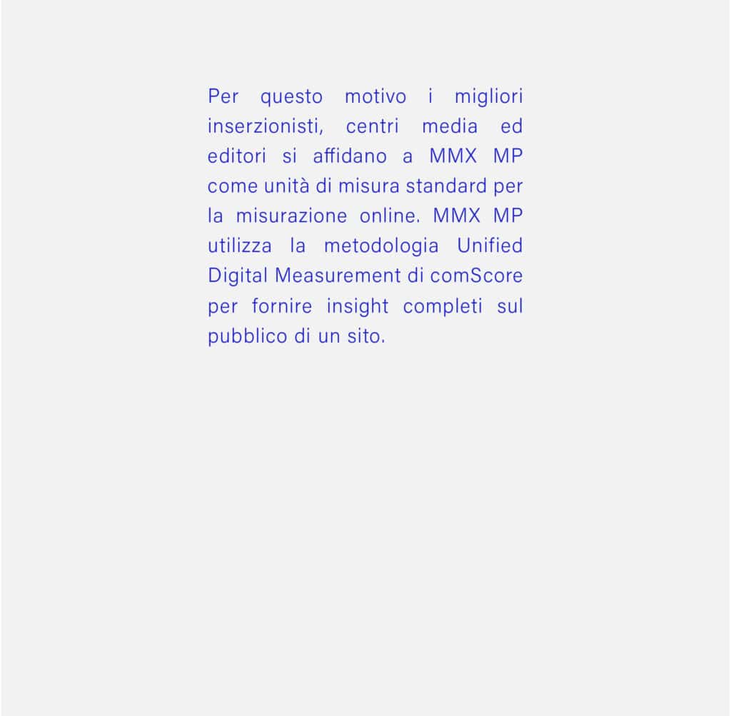 Per questo motivo i migliori inserzionisti, centri media ed editori si affidano a MMX MP come unità di misura standard per la misurazione online. utilizza la metodologia Unified Digital Measurement di comScore per fornire insight completi sul pubblico di un sito.